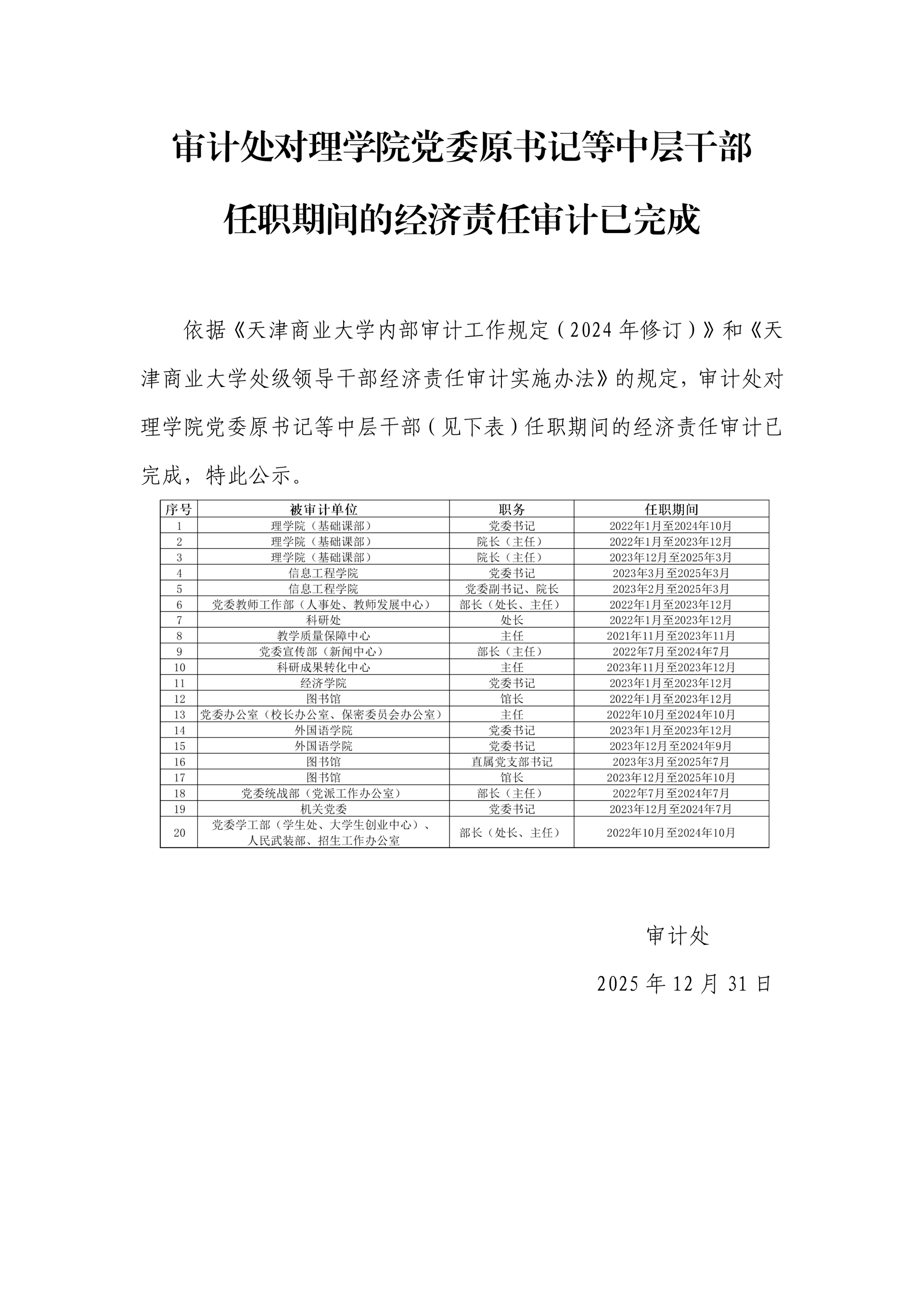 审计处对理学院党委原书记等中层干部任职期间的经济责任审计已完成